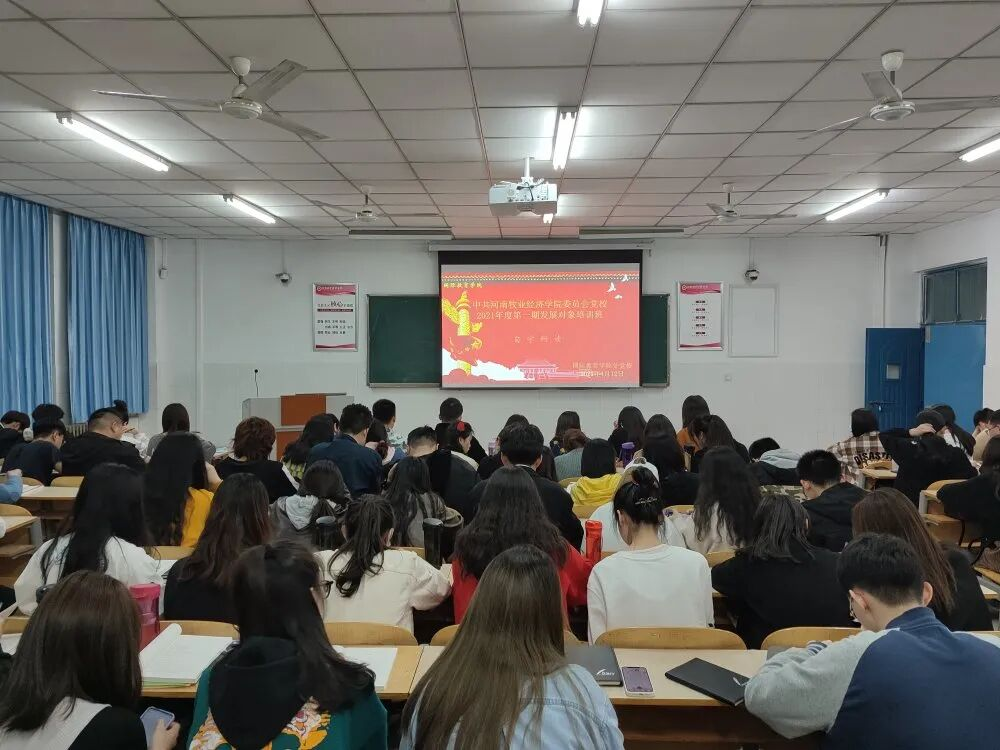 suncitygroup太阳新城官网于2021年4月12日晚在英才校区W205教室开展中共suncitygroup太阳新城官网委员会党校2021年度第一期发展对象培训班第一讲。本次培训内容为《党员发展对象》教材,由培训班学员组长李安煜主持。
