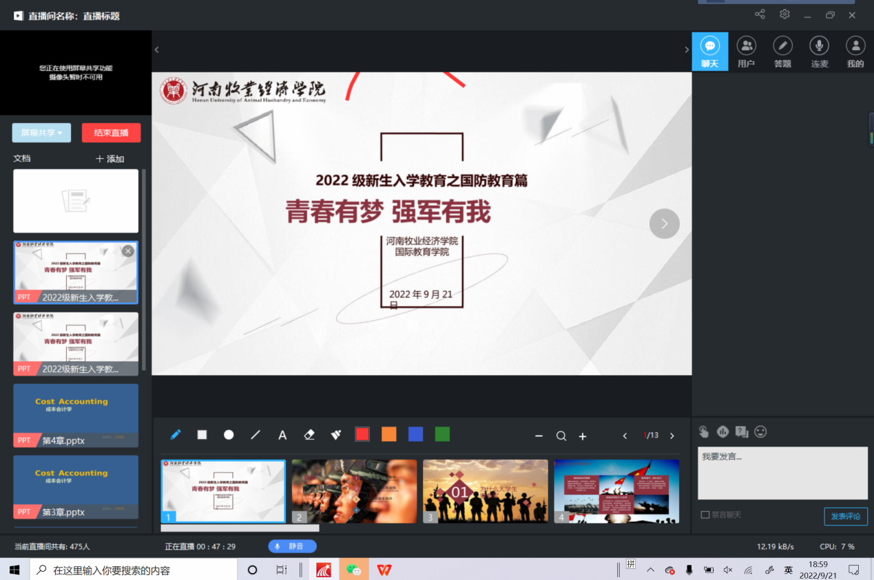 古之立大事者,不惟有超世之才,亦必有坚韧不拔之志。为加强新生国防教育观念,强健学生体魄,使国防教育常态化,培育国防后备人才,9月21日晚上,suncitygroup太阳新城官网组织全体2022级新生开展了以“青春有梦,强军有我”为主题的线上国防教育。本次国防教育专题讲座由刘颖颖老师主讲。