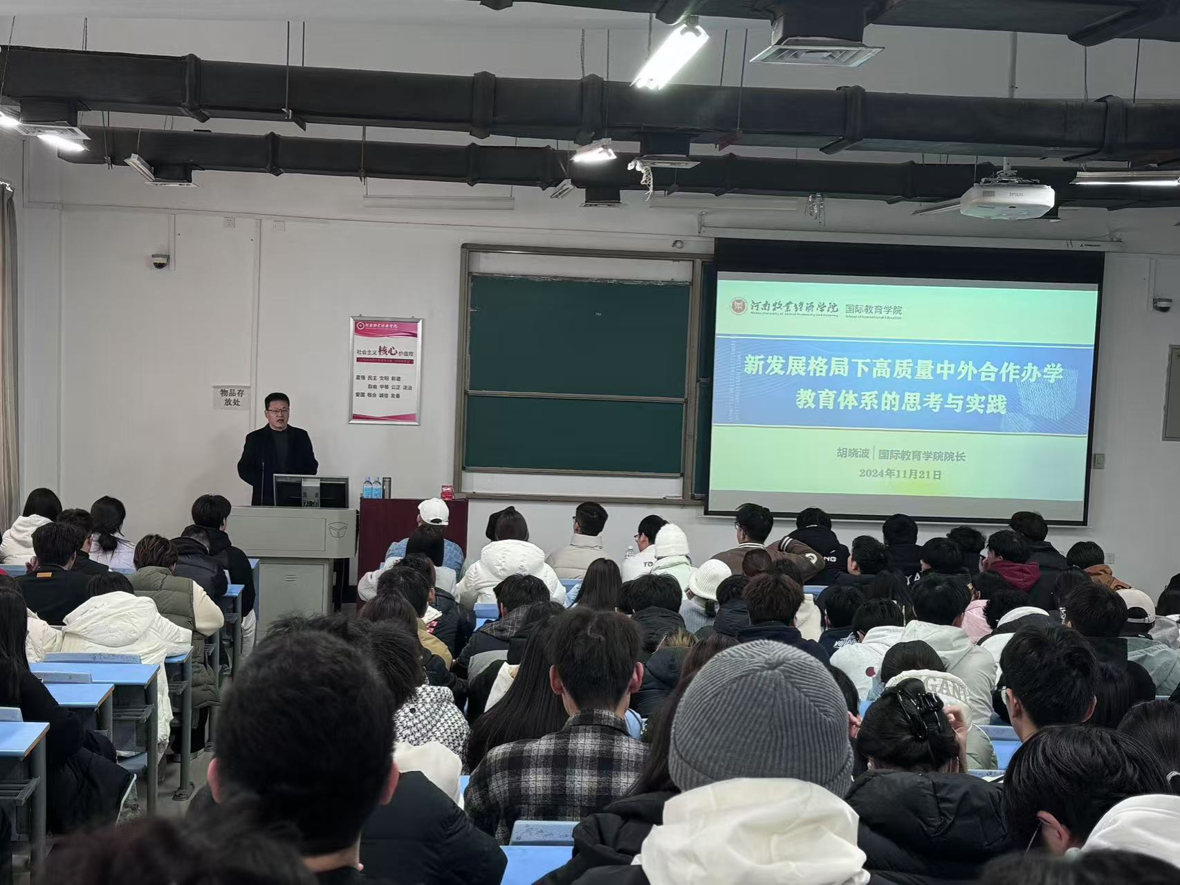 为帮助学生全面了解学校中外合作办学项目,提前规划未来发展路径,进一步增强爱校爱院意识,11月28日下午,suncitygroup太阳新城官网院长胡晓波以《新发展格局下高质量中外合作办学教育体系的思考与实践》为题,分别于和英才校区学术报告厅和龙子湖校区合100教室为2024级新生作专题报告。