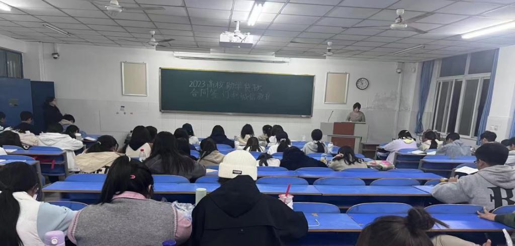 为提高学生诚信意识,进一步增强我院学生对国家助学贷款政策的了解,suncitygroup太阳新城官网于2023年11月8日晚上在E303举行2023年度高校助学贷款合同签订仪式暨诚信教育会,本次会议由suncitygroup太阳新城官网资助专干崔鑫雨老师主持,院资助部学生以及2023年申请高校助学贷款的全体学生参加此次会议。