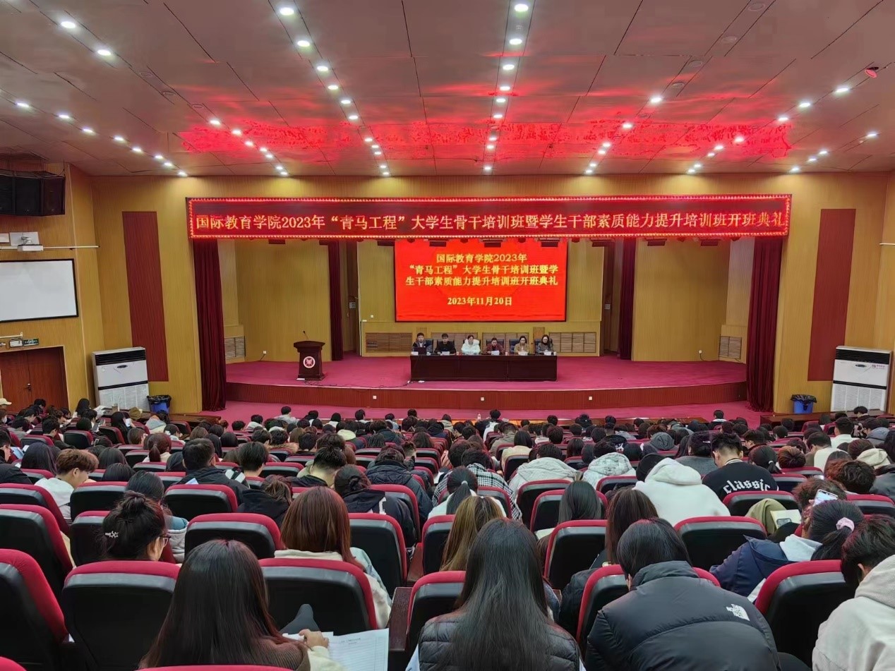 2023年11月20日,我院“青马工程”大学生骨干培训班暨学生干部素质能力提升培训班在学术报告厅举行。院党委副书记李江红,院团委书记张丽,院团委副书记侯丁琳、何季霖,辅导员滑斌、侯思琦,院“青马工程” 学员和全体学生干部参加了开班典礼,典礼由何季霖主持。