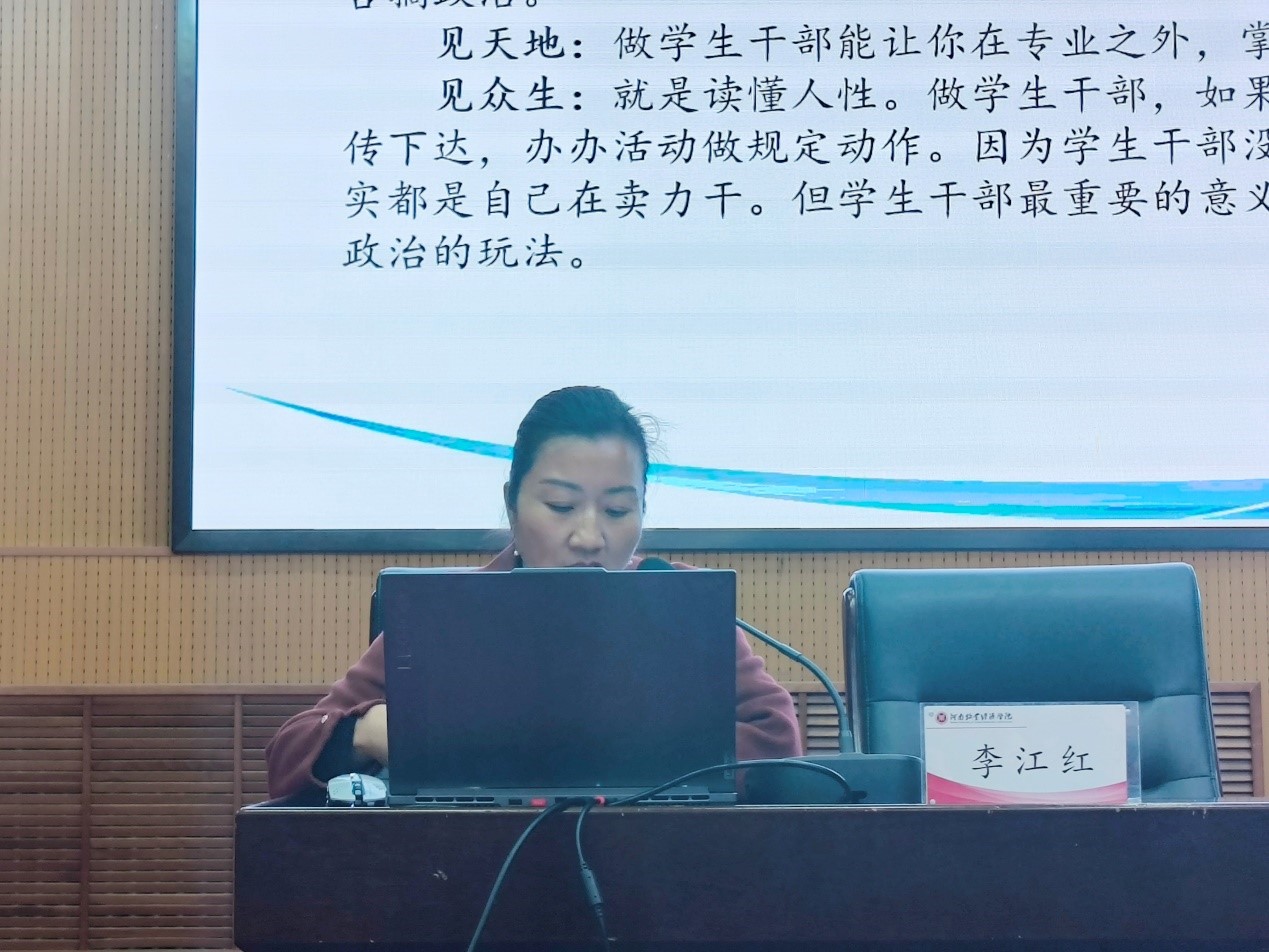 李书记首先从作为学生干部,你的大学生活要怎么过这一问题引入主题,随后从学生干部的定义,学生干部的素养,学生干部的学习与职业发展三方面开讲,对学生干部的风貌展现和发展规划提出了要求,作为学生干部应该找准定位,拓宽思维,要平衡好工作与学习之间的关系,切实完善自身知识结构,努力提高自身的语言表达、沟通社交、组织领导等全方面能力,提高自身综合素质。在锻炼自我综合能力的同时,发挥模范带头作用,积极的为促进我院创新发展贡献一份力量,体现我院学生干部队伍砥砺求实的风采。她希望大家低头有坚定的脚步,抬头有清晰的远方,发挥个体能力和集体合力,在实现个人成才的同时,服务学院发展。