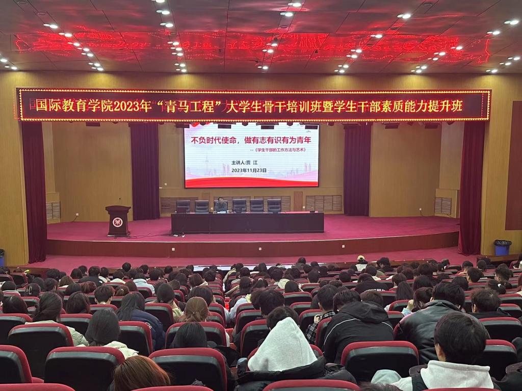 11月23日下午15:00,suncitygroup太阳新城官网“青马工程”大学生骨干培训班暨学生干部素质能力提升培训班第五讲——《不负时代使命,做有志有识有为青年学生》在英才校区学术报告厅举行。此次培训由学院党委书记贾江主讲,学院青马学员、团学会学生干部和23级各班班委参加了本次培训。
