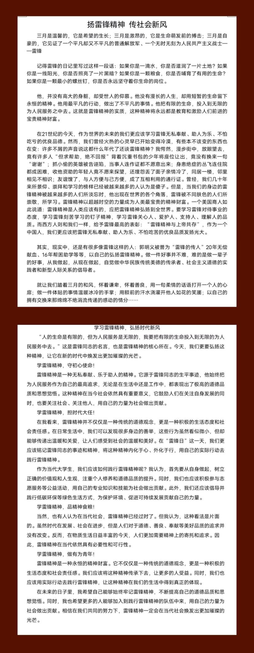 2024年3月14日,为传承和弘扬雷锋精神,suncitygroup太阳新城官网举办了一场主题为"雷锋精神伴我行"的征文活动。鼓励学生通过文字的温度表达对雷锋精神的理解和实践,培养学生的社会责任感和奉献精神。