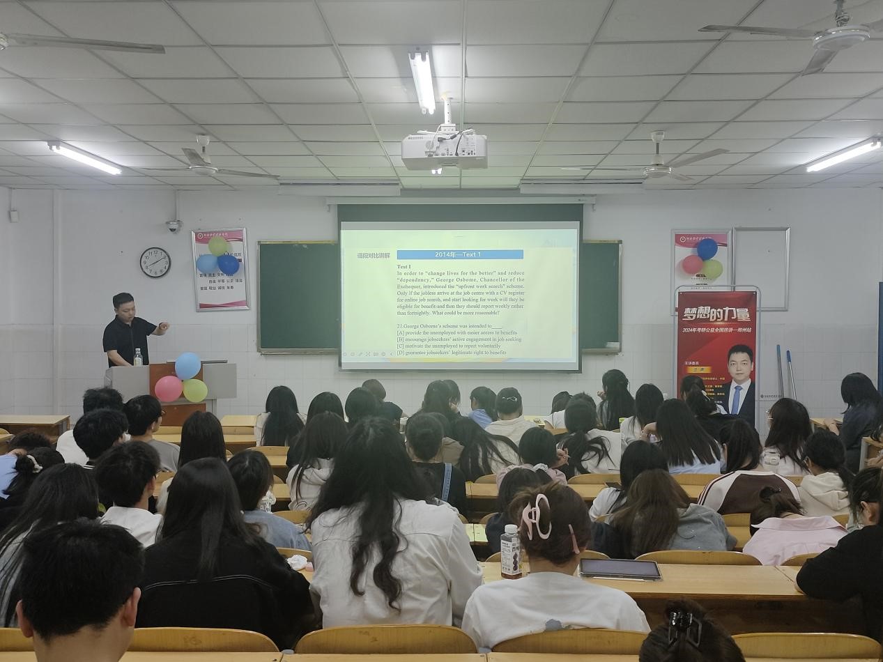 讲座中,兰熙老师就考研备考策略、学科复习方法、英语考试技巧等方面进行了深入浅出的讲解。尤其在学科复习方法方面,兰老师强调了理解与记忆相结合的重要性。他提倡同学们通过多做题、多总结来加深对知识点的理解和记忆,提高解题能力和应试技巧。此外,兰熙老师分享了一些备考心得和成功案例,鼓励学子们保持积极心态,坚持到底。兰熙老师在英语领域颇有建树,他以英语备考为例,通过问答的形式活跃现场气氛,同学们也全神贯注地投入其中,在欢声笑语中对考研英语的切入点有了基本的了解。大家纷纷表示,兰老师的讲解让他们对考研有了更清晰的认识和更明确的方向,也感谢学院能够提供这样一个难得的学习机会。