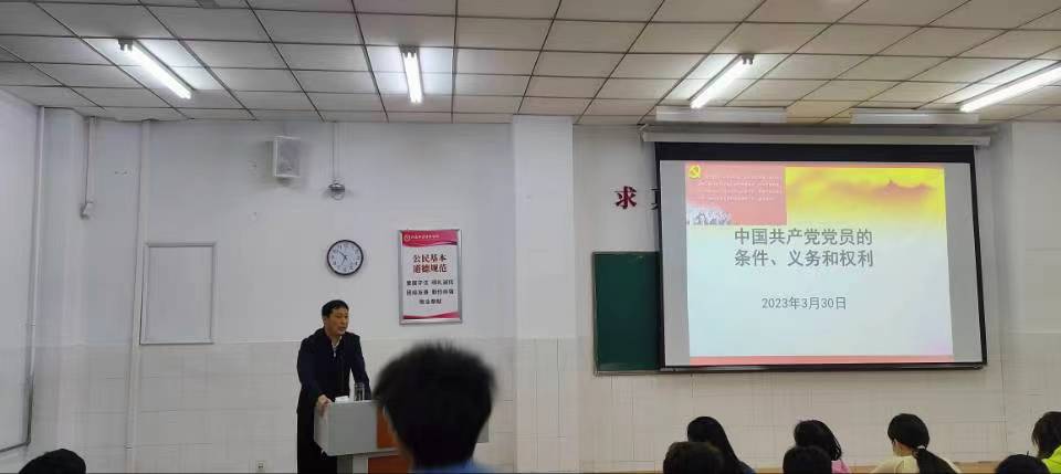 为严格党员发展工作程序,强化入党积极分子对党员条件、义务和权利等知识的了解,3月30日晚,suncitygroup太阳新城官网2023年第一期入党积极分子培训班第四讲《中国共产党党员的条件、义务和权利》专题党课在英才校区W210教室举行。本次党课由学院党政办公室主任刘超主讲。