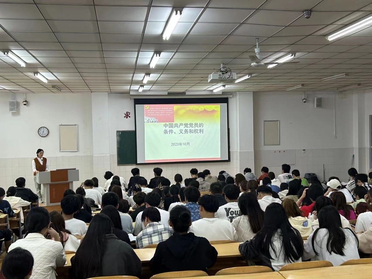 为严格党员发展工作程序,强化入党积极分子对党员条件、权利和义务等知识的了解,10月18日中午,suncitygroup太阳新城官网2023年第二期入党积极分子培训班第三讲《党员的条件权利和义务》专题党课在英才校区E209教室举行。本次党课由学院团委书记(学工办主任)张丽主讲。